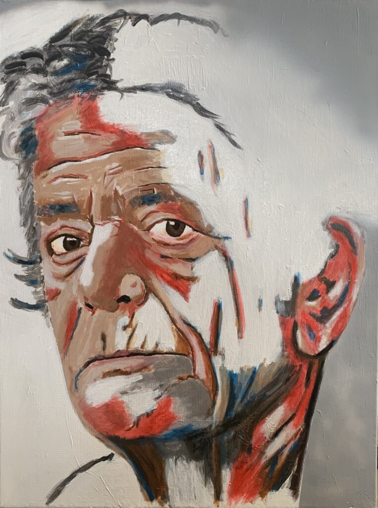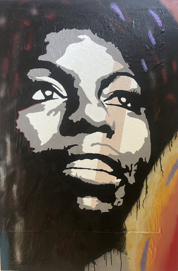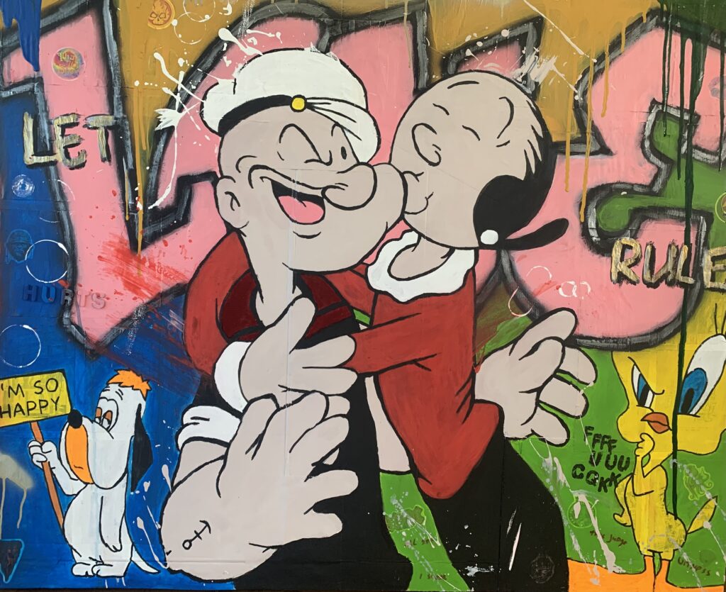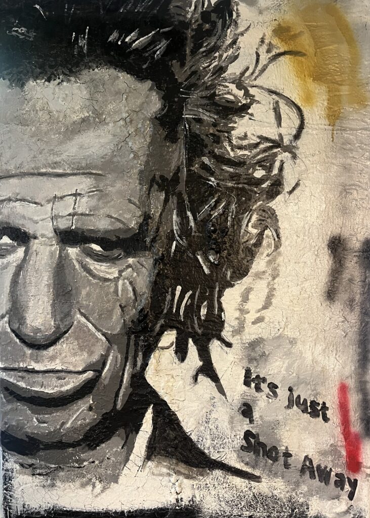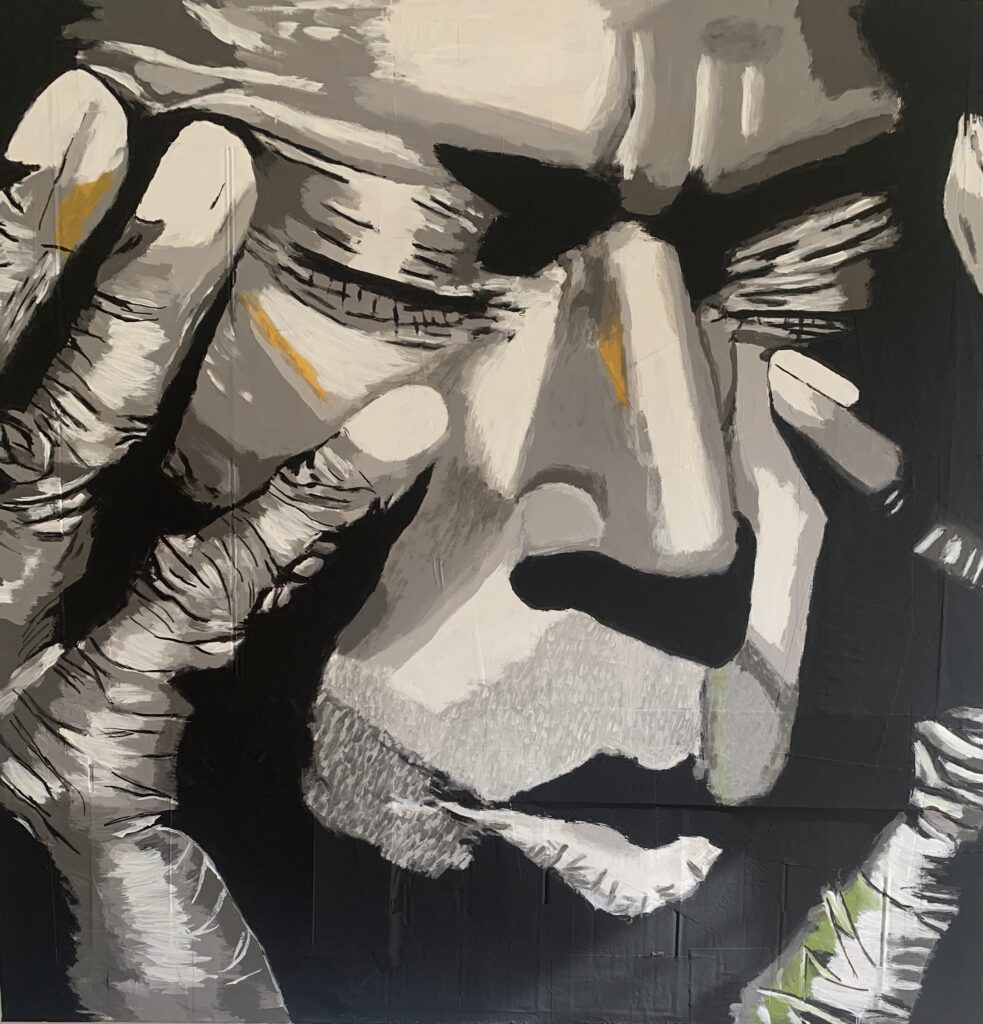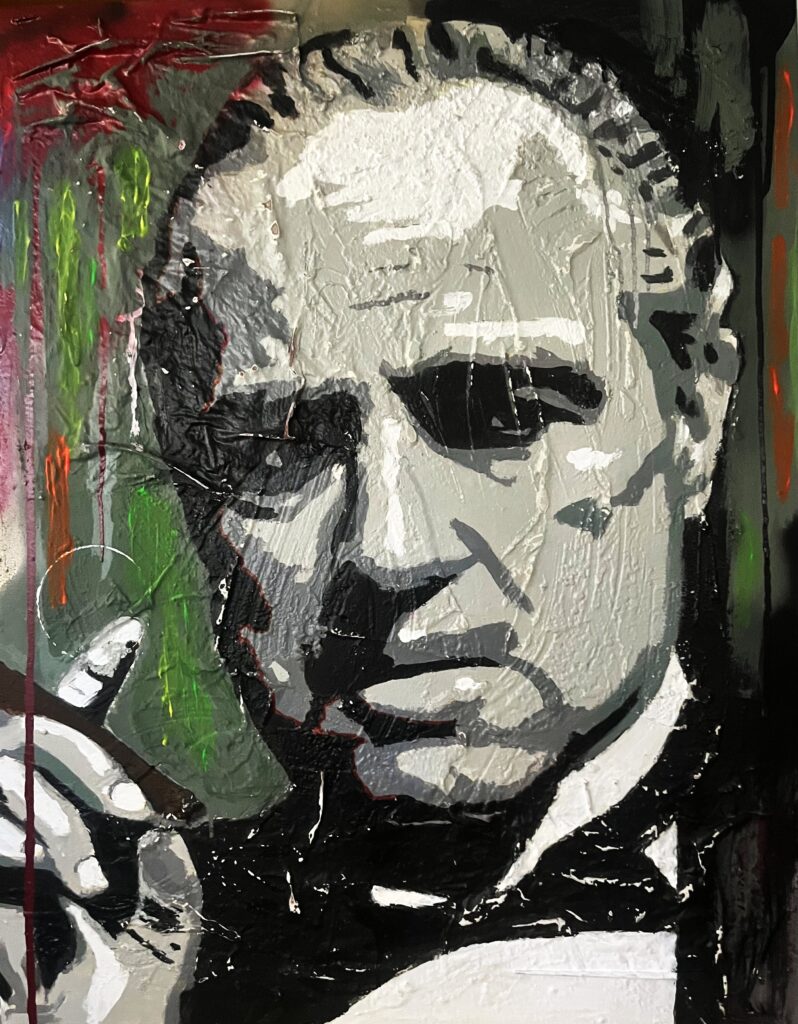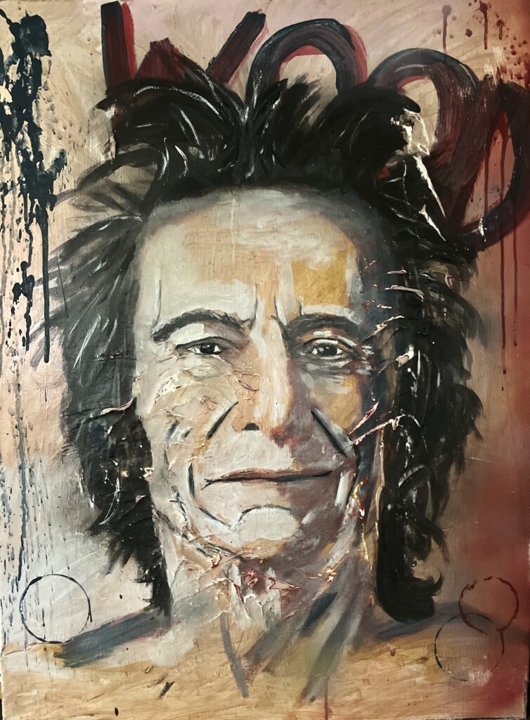 … popidolen, filmsterren, schrijvers en mensen uit mijn omgeving. Ik schilder op doek, hout, karton met spuitbussen, acrylverf, muurverf, meubelverf. Alles kan, zolang het maar imperfect is.
